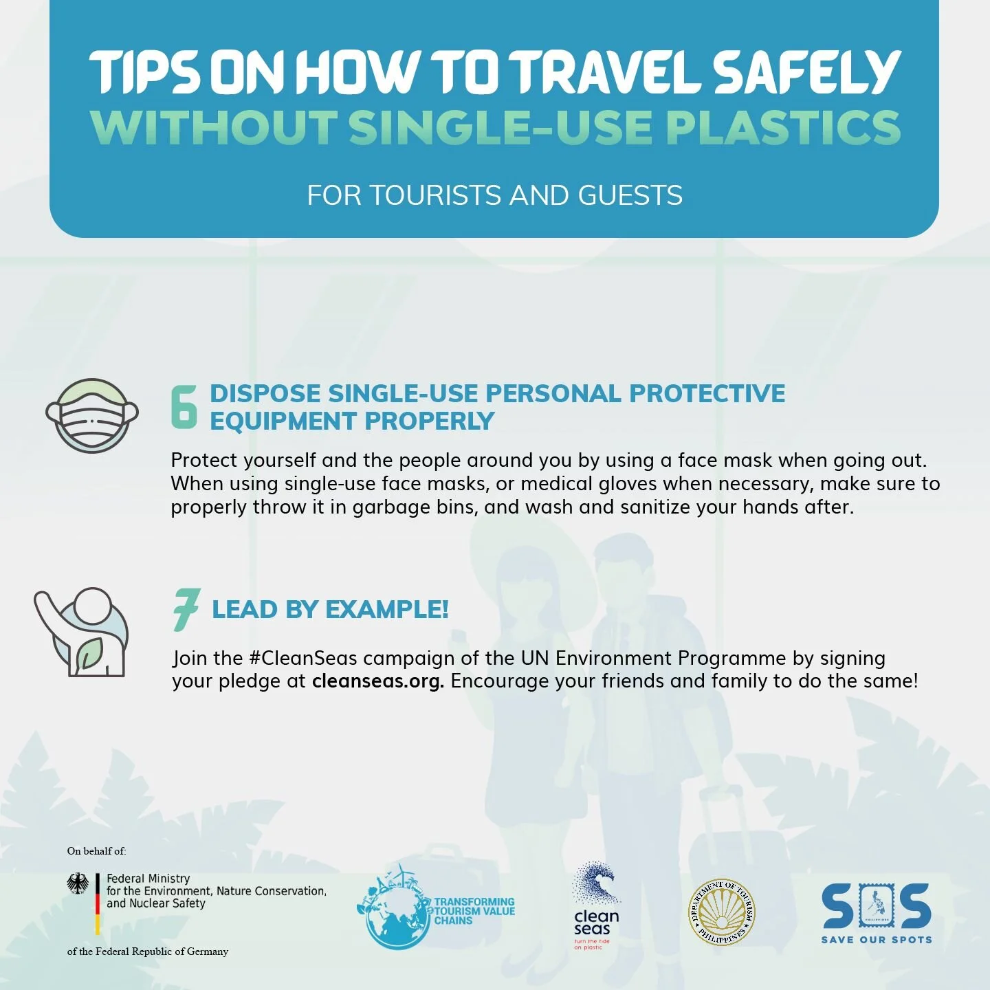 In light of these factors, the Philippine Department of Tourism (DOT), through its sustainability campaign Save Our Spots, has collaborated with the Philippine Center for Environmental Protection and Sustainable Development, Inc. (PCEPSDI), through its Transforming Tourism Value Chains (TVC) project, in cooperation with the UN Environment Programme (UNEP), in creating an awareness campaign to reduce single use plastics (SUPs) in the tourism sector while keeping in mind health and safety protocols. Key messages of the campaign are aligned with the Global Tourism Plastics Initiative (GTPI), which unites the tourism sector behind a common vision to address the root causes of plastic pollution, by enabling tourism stakeholders to lead by example to shift towards circularity and reduction in the use of plastics.